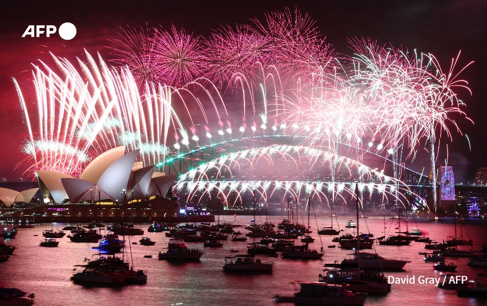 New Year's Eve fireworks light up the sky over the Sydney Opera House (L) and Harbour Bridge during the fireworks display in Sydney on January 1, 2023.