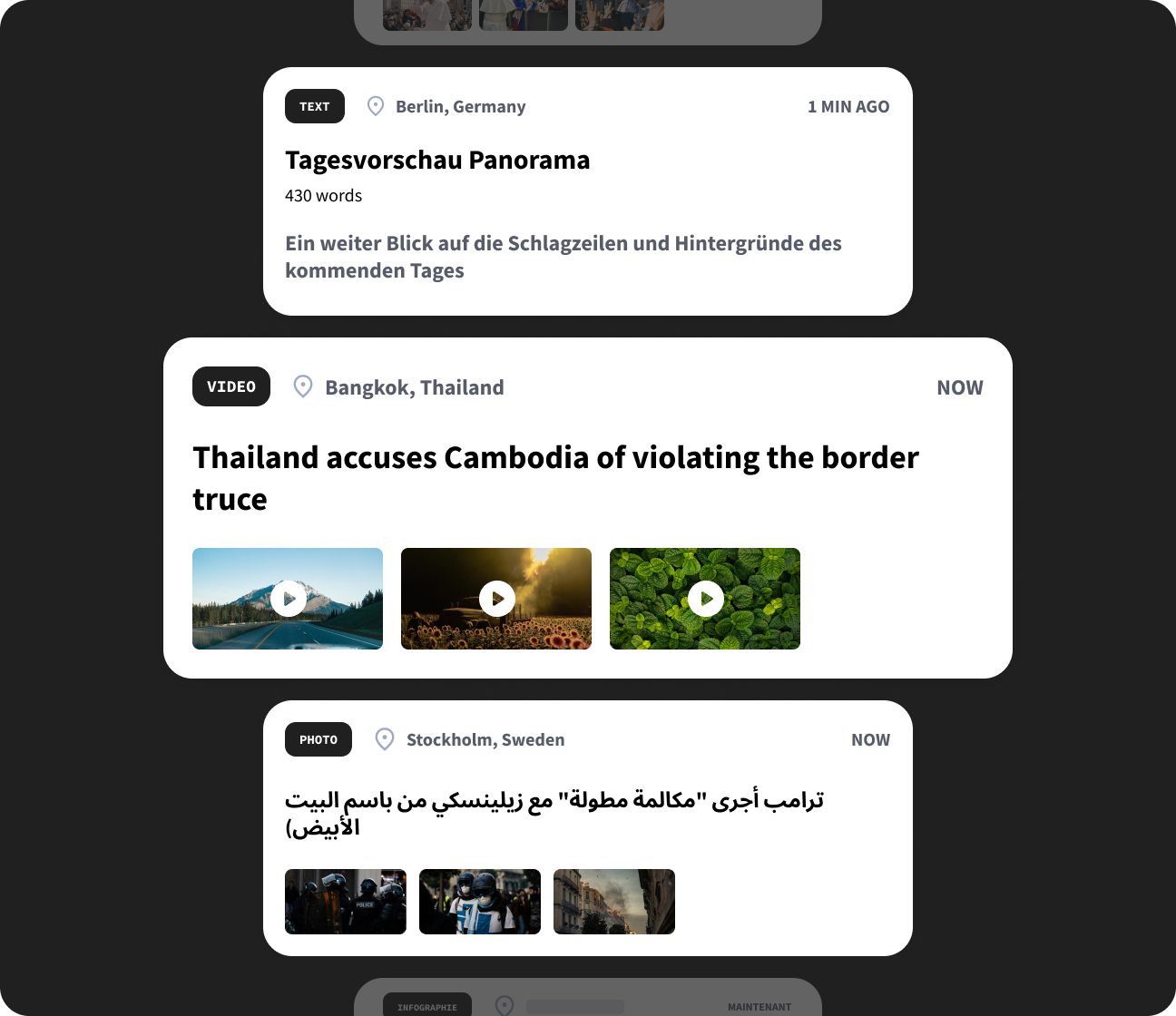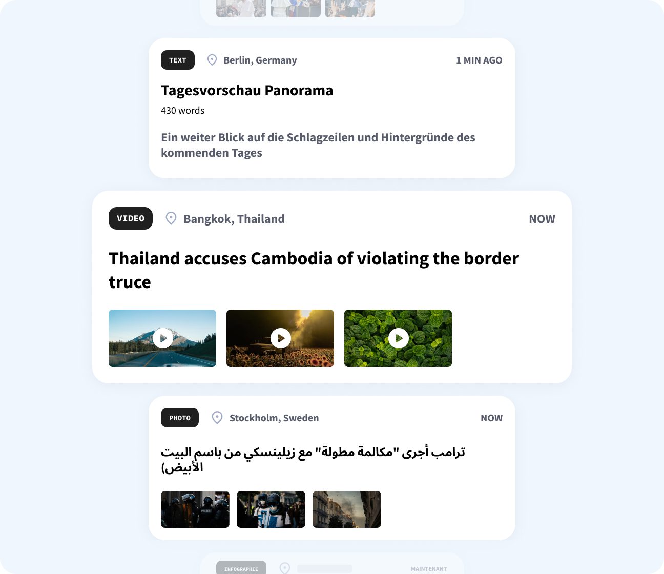 Text content, 6 languages photo & video on AFP’s feed in one or multiple languages.