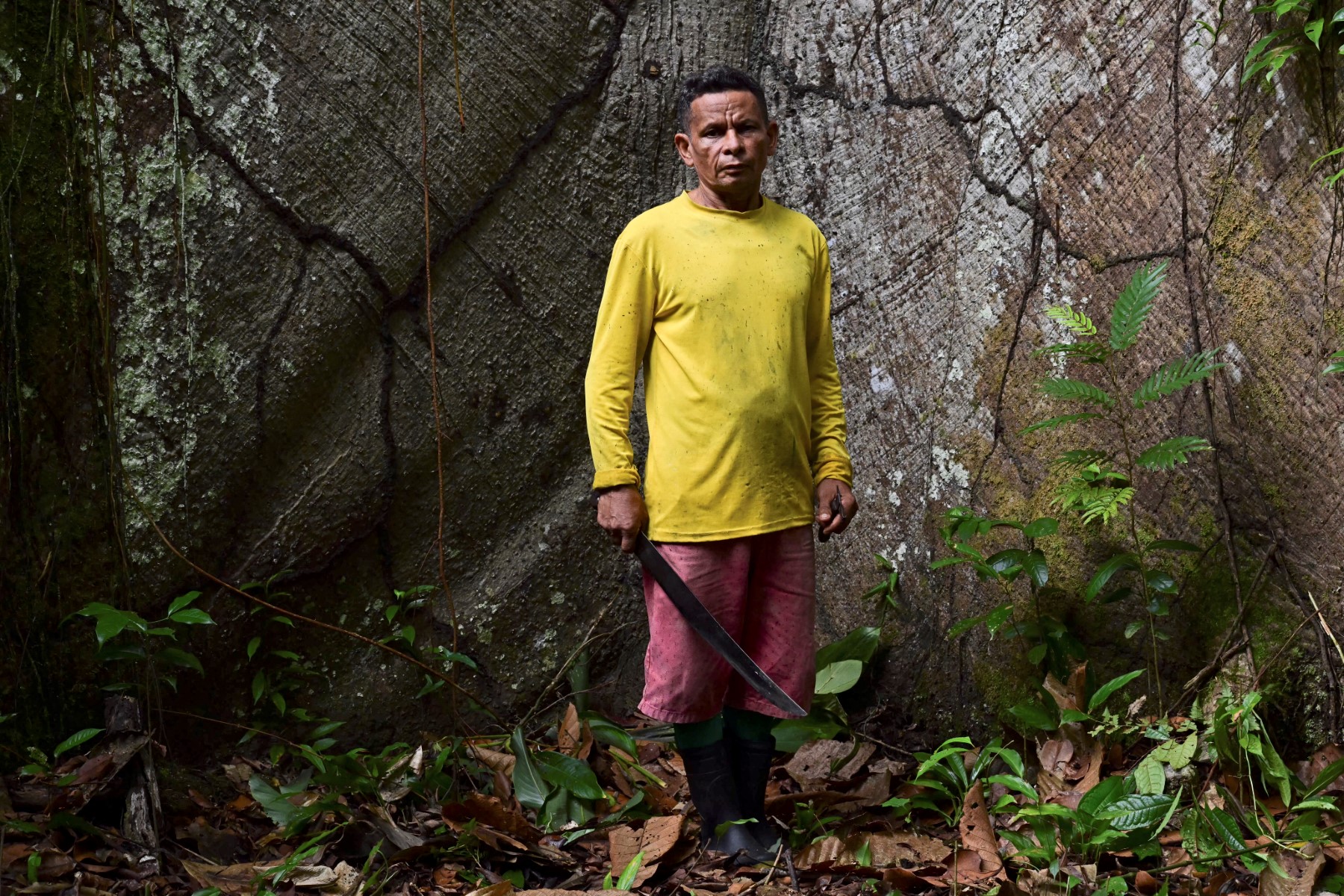 (1) Renato Cordeiro, 57 ans, près de sa maison située dans l’aire de protection environnementale de l’archipel de Marajó, Brésil, le 7 décembre 2024. Le retour récent du métier de saigneur de caoutchouc a redonné vie à une économie durable et créé des emplois pour des familles. © Pablo Porciuncula / AFP