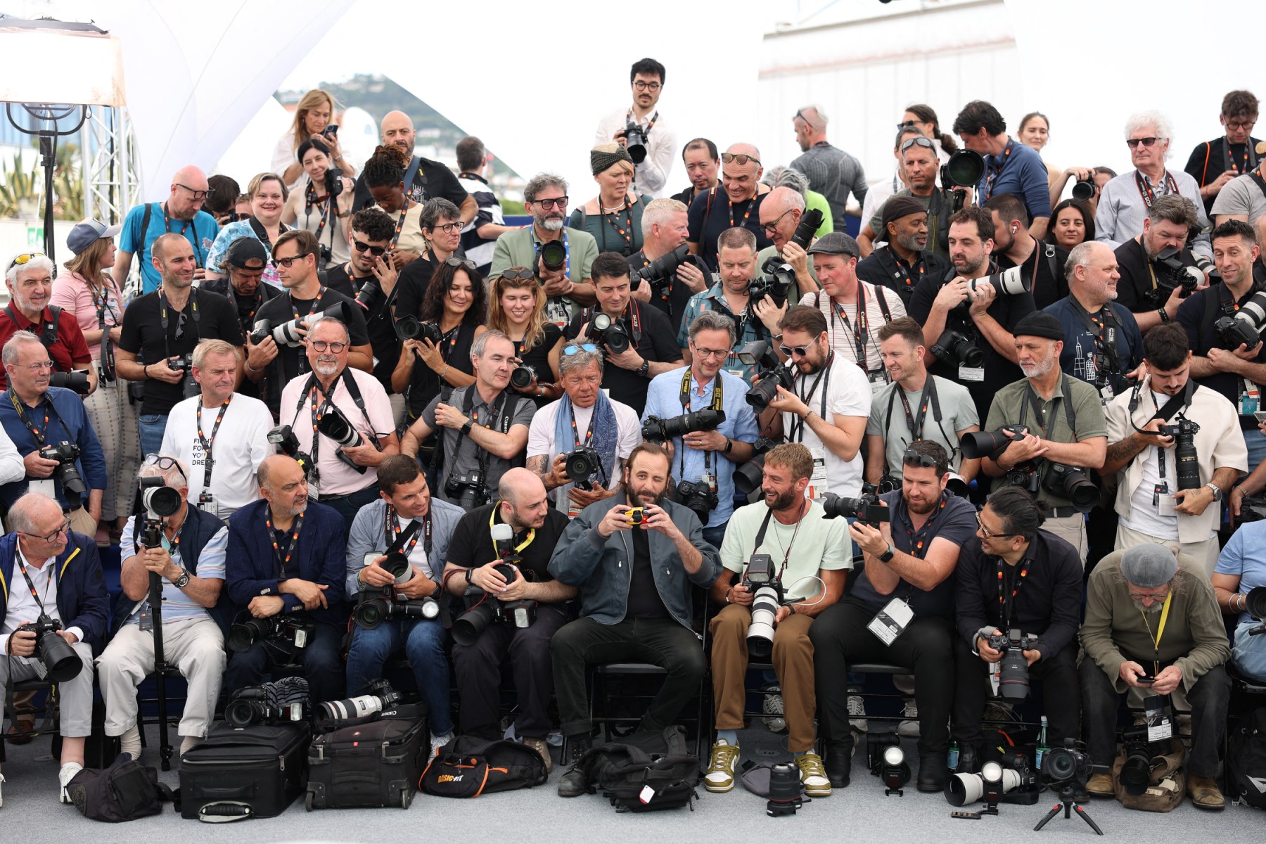 L’acteur français Vincent Macaigne (au centre, au premier rang) est assis parmi les photographes lors d’un photocall pour le film « Arco », le 16 mai 2025. © Sameer Al-Doumy / AFP