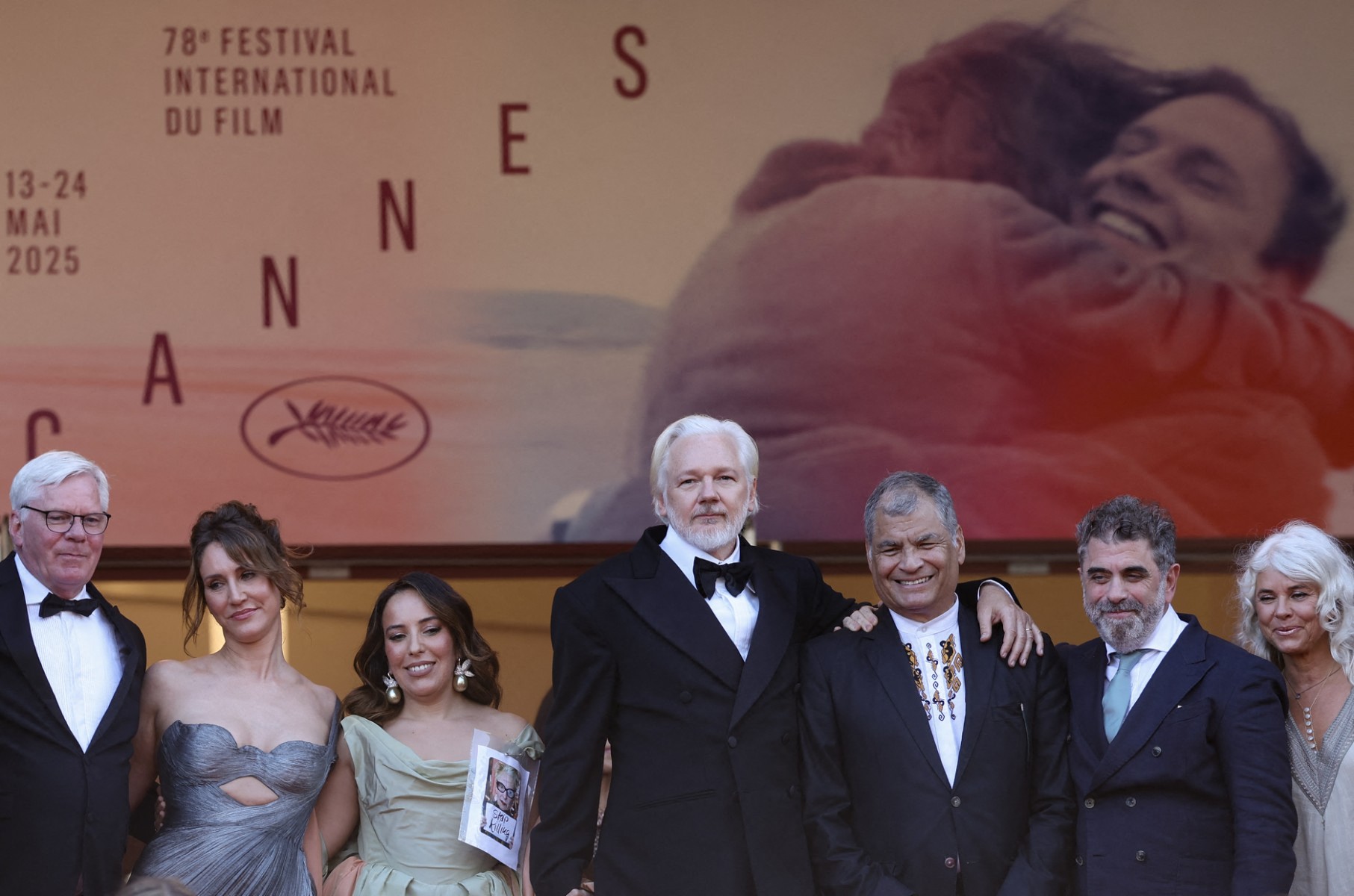 (De la 2e à gauche) La productrice franco-britannique Kathleen Fournier, l’avocate suédo-espagnole Stella Assange, l’éditeur et militant australien Julian Assange, ainsi que l’ancien président de l’Équateur Rafael Correa arrivent pour la projection du film « The Six Billion Dollar Man », le 21 mai 2025. © Sameer Al-Doumy / AFP