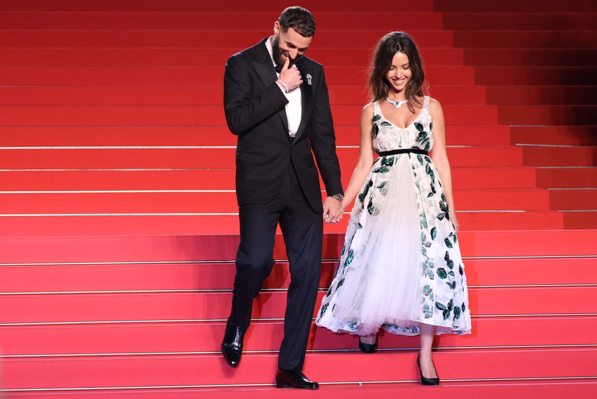 L’attaquant français de l’Ittihad, n°09 Karim Benzema, et l’actrice franco-algérienne Lyna Khoudri, le 23 mai 2025. © Sameer Al-Doumy / AFP