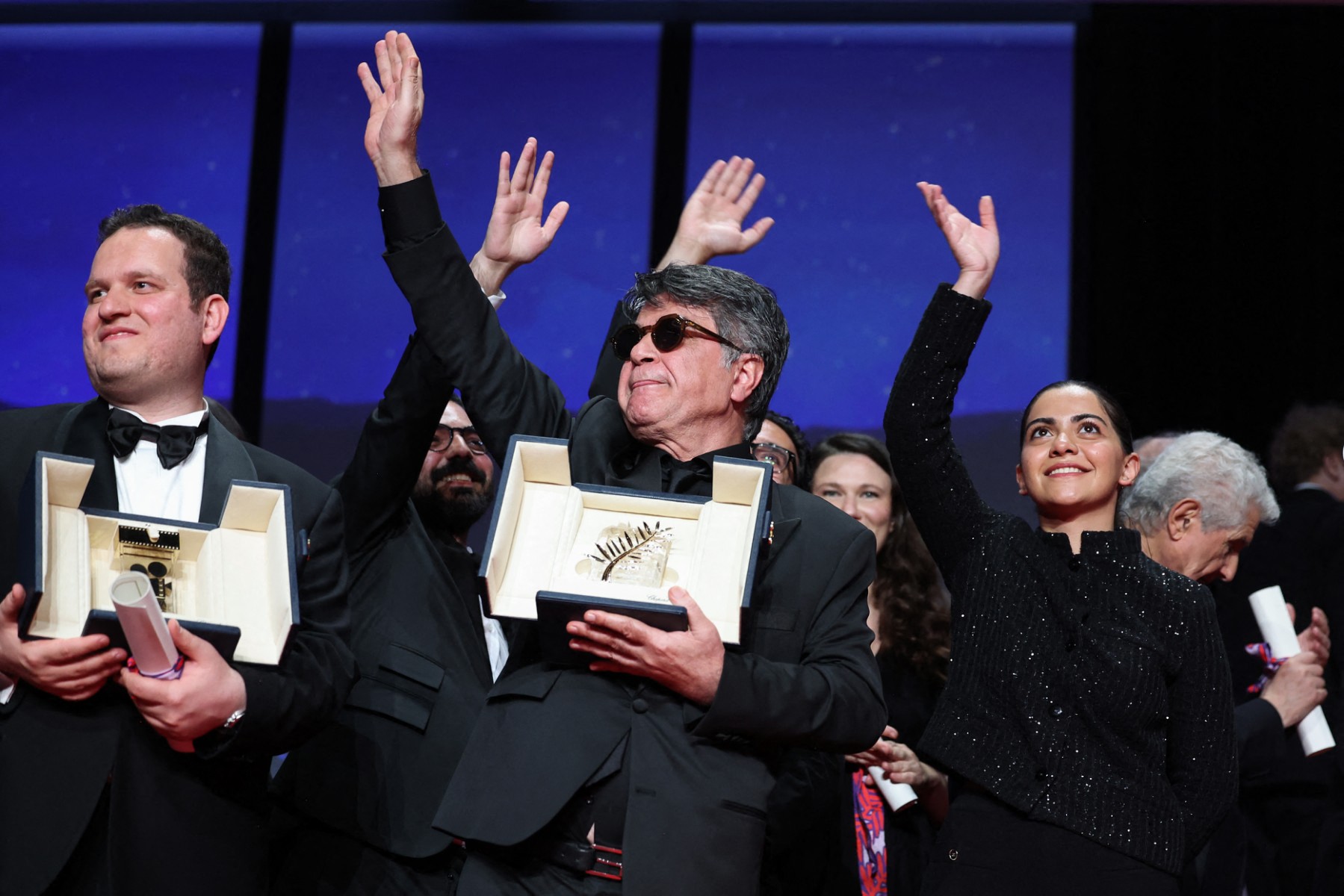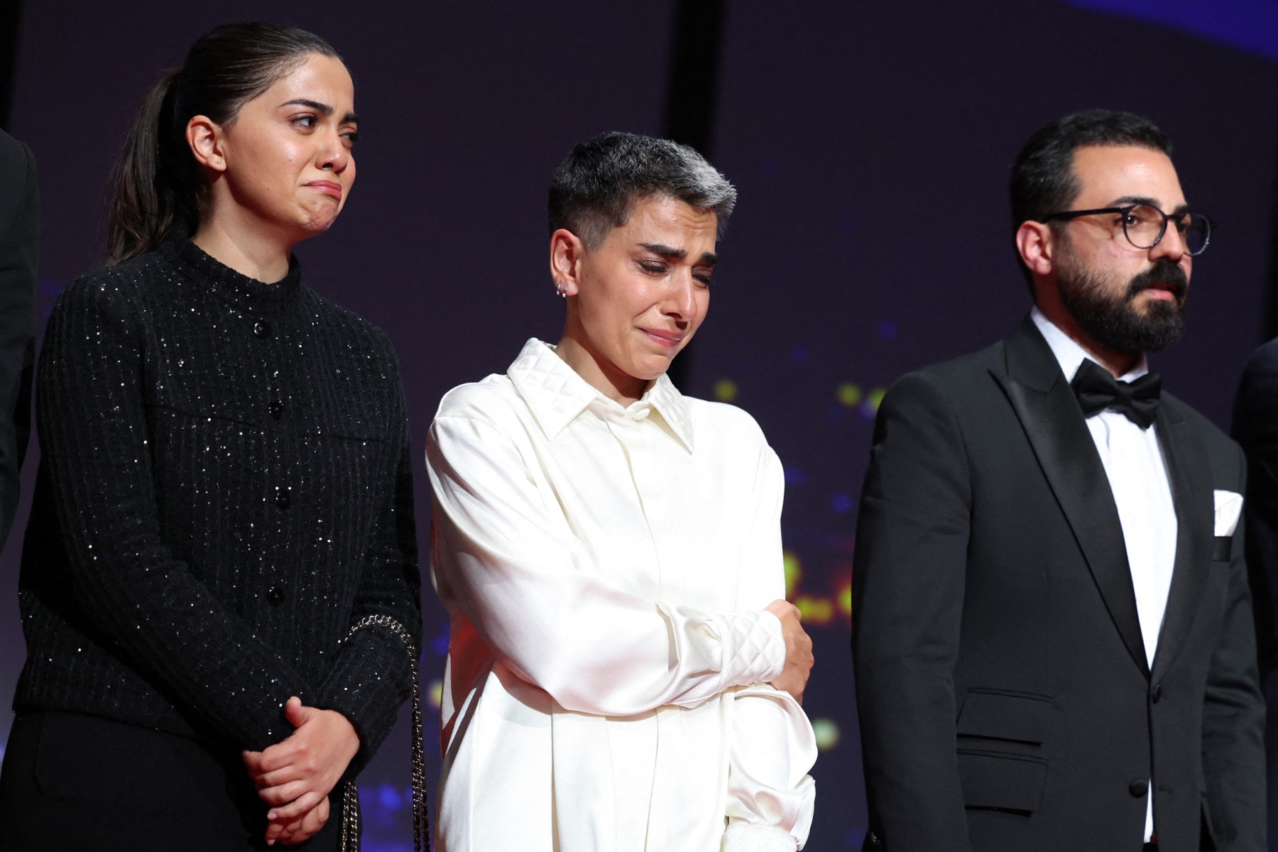 • 3e photo : Le réalisateur irakien Hasan Hadi, lauréat de la Caméra d’or pour le film « The President’s Cake », le réalisateur, scénariste et producteur iranien Jafar Panahi, et l’actrice iranienne Hadis Pakbaten, le 24 mai 2025. © Valery Hache / AFP