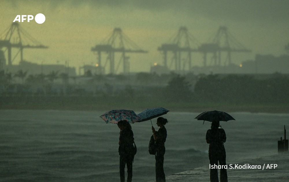 Women holding umbrellas stand at the Galle Face promenade amid heavy rainfall in Colombo on May 14, 2024.