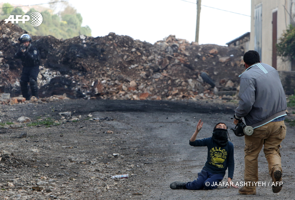 4 mars 2016 - Kfar Qaddum, Cisjordanie - Un Palestinien se précipite vers un garçon blessé lors d'affrontements avec les forces de sécurité israéliennes suite à une manifestation contre l'expropriation de terres palestiniennes par Israël, dans le village de Kfar Qaddum, près de Naplouse, en Cisjordanie occupée. © AFP PHOTO / JAAFAR ASHTIYEH