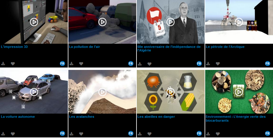Les vidéographies fournissent un contenu pédagogique sur des sujets variés comme « Le parlement européen », « L’école du futur », « Comment se forment les tornades », « Les grandes forêts menacées »… Certaines vidéographies sont proposées en anglais (« La maison connectée », « Les volcans »...)  et en espagnol (« Les grands naufrages », « Les élections aux États-Unis »…)